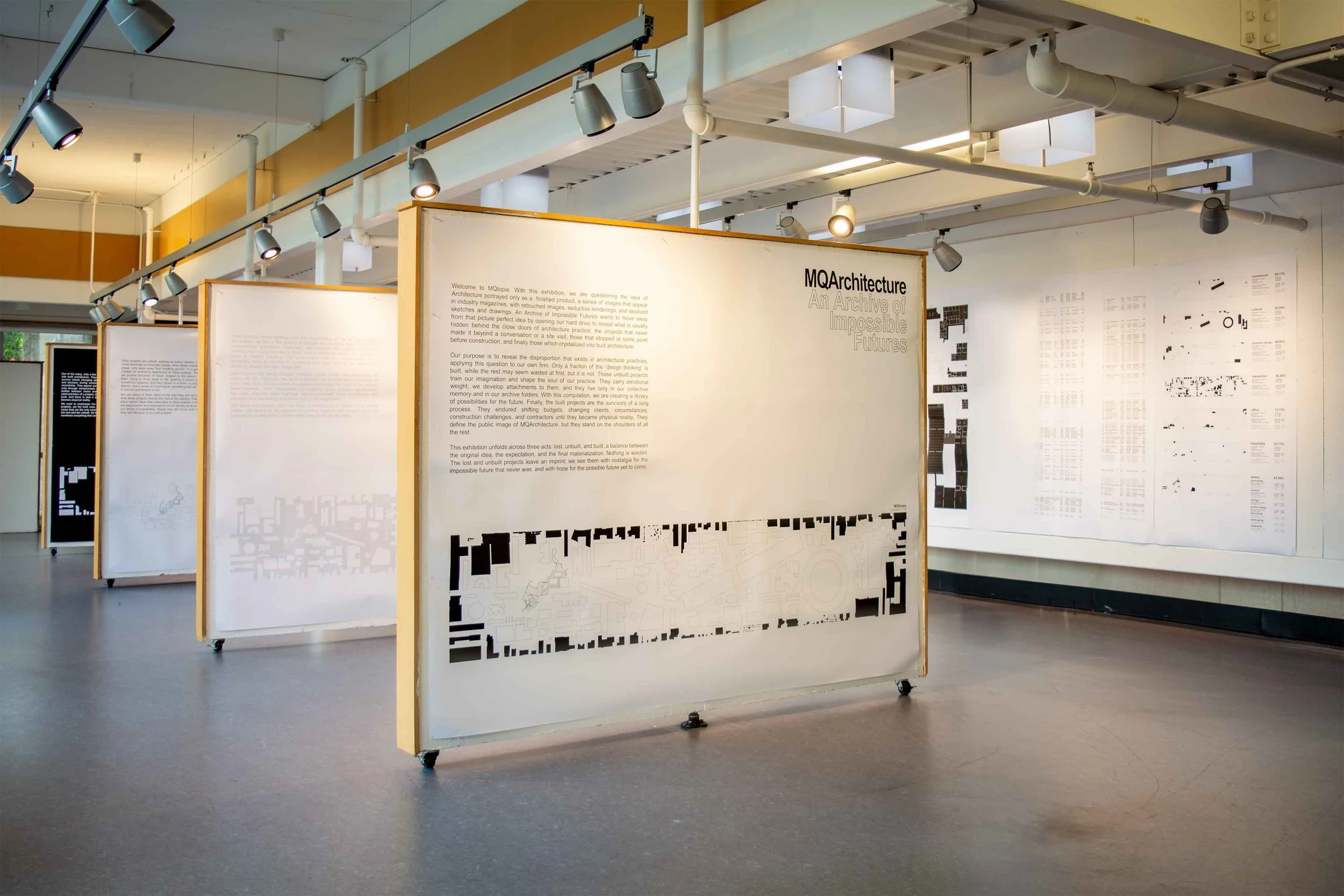 Welcome to MQtopia. With this exhibition, we are questioning the idea of Architecture portrayed only as a finished product, a series of images that appear in industry magazines, with retouched images, seductive renderings, and idealized sketches and drawings. An Archive of Impossible Futures wants to move away from that picture perfect idea by opening our hard drive to reveal what is usually hidden behind the close doors of architecture practice: the projects that never made it beyond a conversation or a site visit, those that stopped at some point before construction, and finally those which crystallized into built architecture.