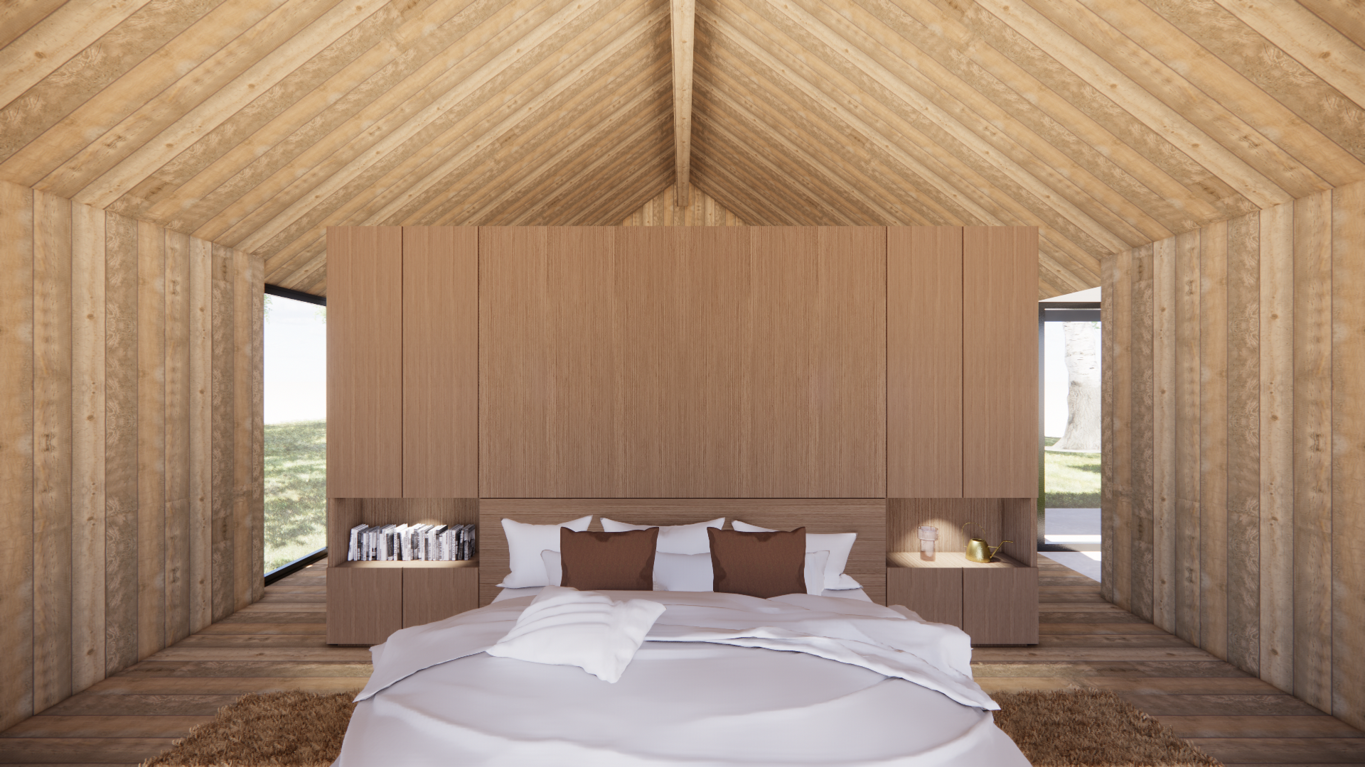 Inside, the warmth and rustic appearance of reclaimed wood wraps the floors, walls, and ceiling. The central focal point is the rectangular volume crafted from burl wood, that contrasts to the reclaimed wood. This volume hosts the bed, walk-in closet, and bathroom appliances.