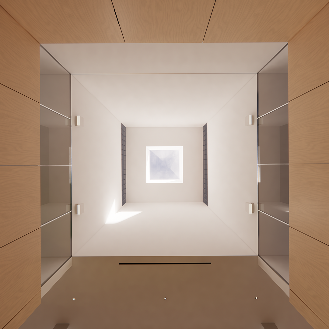 One of the apartments features a cubic opening crowned on its top with a square skylight, adding a unique touch to the building's design. This allows for ample natural light, creating a bright interior environment that is both inviting and comfortable.