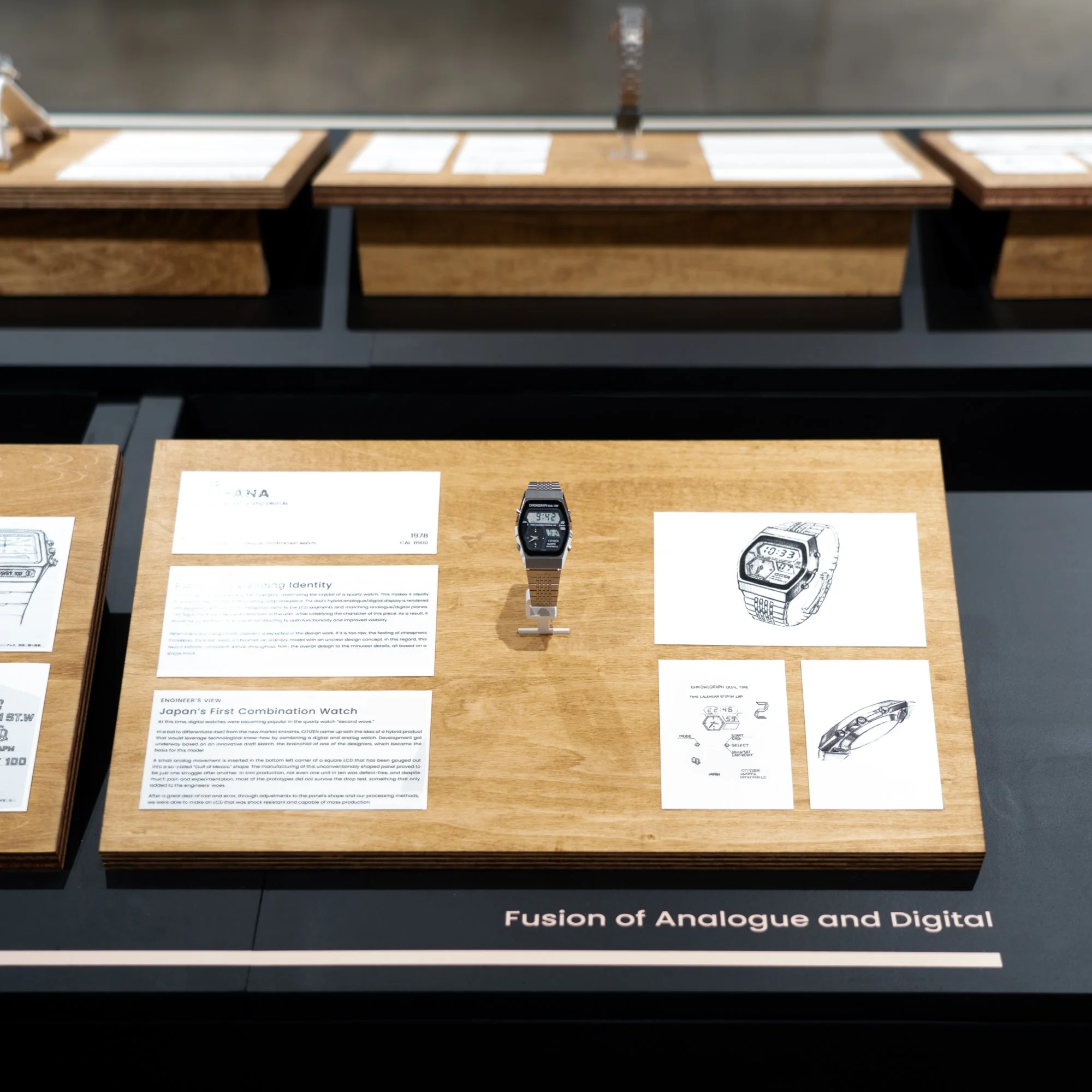 We developed singular display solutions for special pieces of the collection: the 2 pocket watches and the 5 new watches. The two pocket watches—one from 1924 and the latest from 2024—were displayed on a black floating shelf on the entrance wall, with the only vertical panel of the exhibition showing the drawings of the pocket watches. The five newest watches were exhibited in transparent cases, positioned on a shelf between the only two columns that were not aligned with the central line of columns.