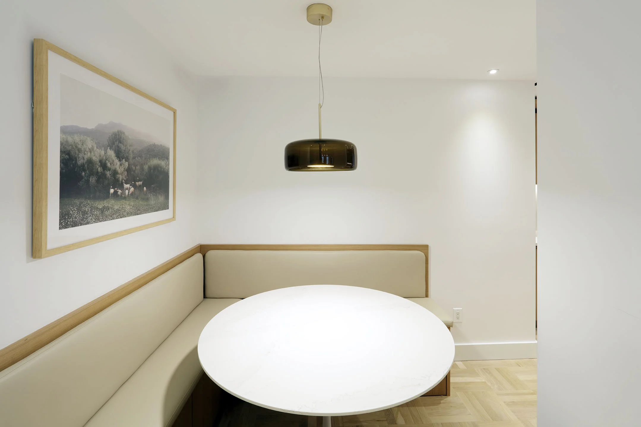 This project entailed merging an existing 3-bedroom 2-bath apartment with a newly acquired studio unit and the installation of a centralized cooling system. The new mergged footprint of the apartment allowed a significant expansion of the kitchen footprint, incorporating a breakfast nook as per the owner’s request, as well as a new Washer/Dryer and laundry room.