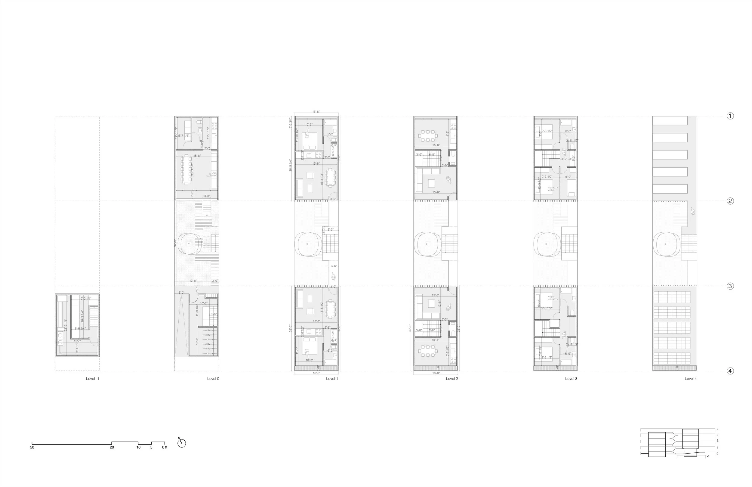In order to build a successful community, we believe our design must allow structuring different size apartments for different family organizations. Our staggered staircase facilitates introducing duplex units, hence, depending on the needs of each particular site, we can provide combinations of studios, 1 bedroom, 2 bedroom and 3 bedroom units. In our presentation we propose two 1 bedroom units on the lower levels and two duplex structures on top (one 2 bedroom unit and one 3 bedroom unit), however, the flexibility of this design would allow up to six units.