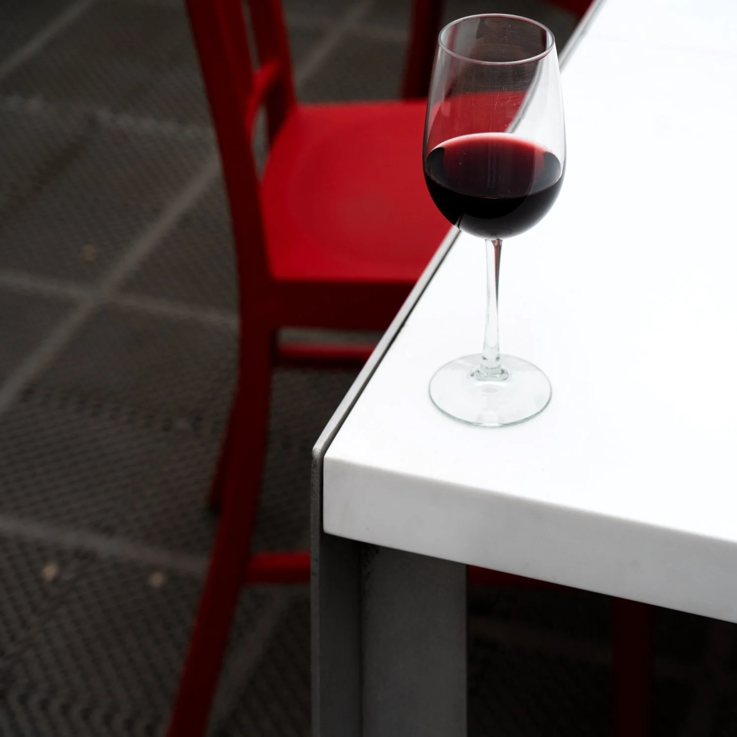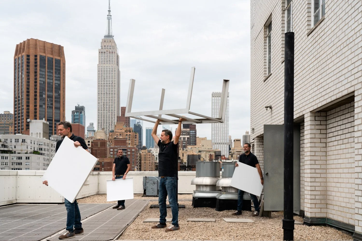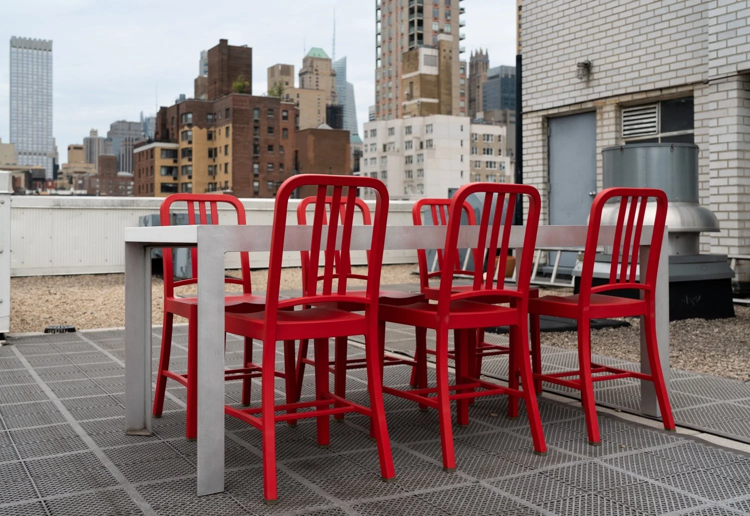 The design of this table came as a specific need while working on a small penthouse renovation in Manhattan. Given the limited space of the residence, the client requested a table that could be used equally indoors and outdoors, therefore, our design needed to be weather resistant and easy to transport. The idea was to use an aluminum frame, that could be easily transported by a single person, and a removable top. As we thought the table would stay outdoors longer than inside, we looked for a heavy material that would give the table stability and resistance to uplift. Therefore, we split the top in three equal units that would make for an easy transportation. We chose a solid surface material with a low percentage of high resistance resins, warm to the touch, stable not to yellow under the direct sunlight, and highly resistant to inclement weather.