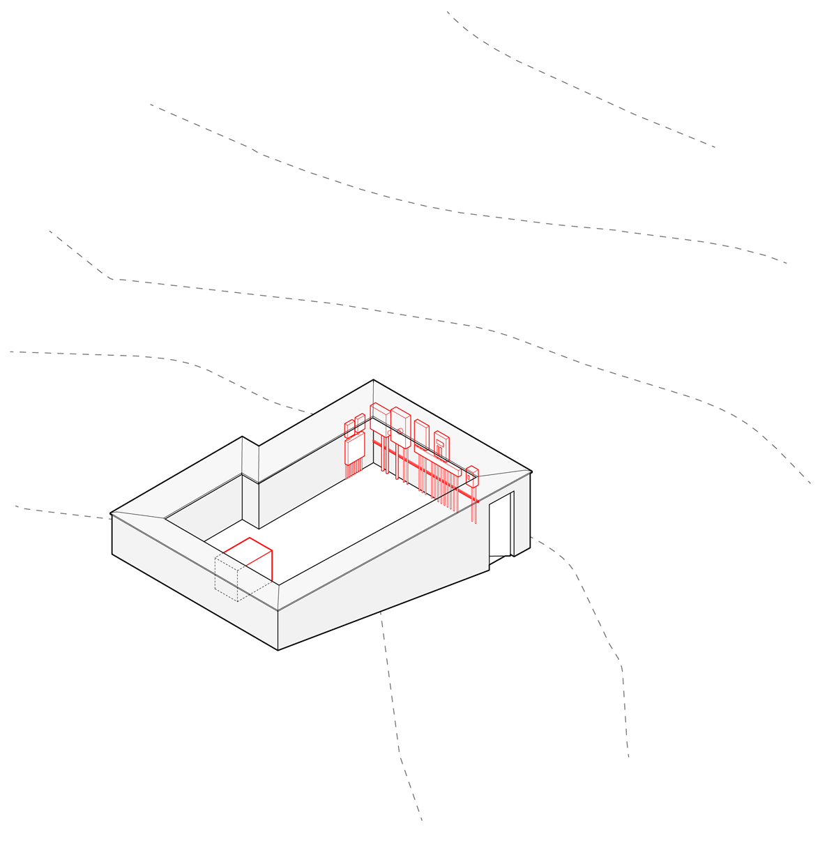 This project entitled a surgical demolition of an existing shed and the erection of a small ancillary building. The old structure housed the electrical and communications utilities of a large compound, and the new project had to preserve the location and function of all this equipment, therefore some walls and floor levels are set from the beginning.