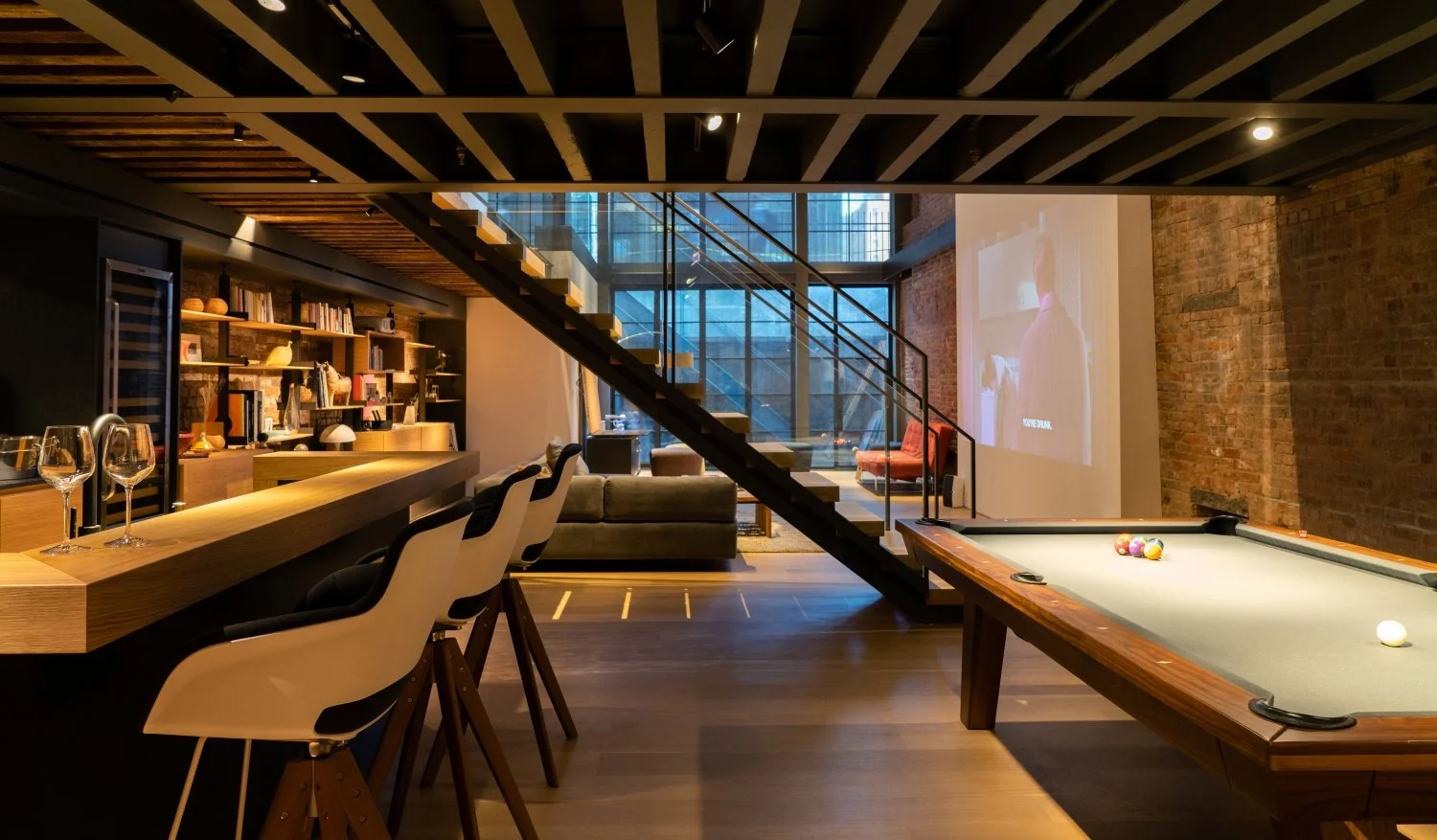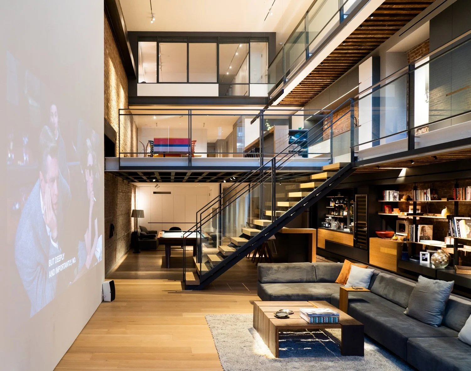 Inside, the three levels are strategically laid out to allow for an intense public program, keeping the Master bedroom/bathroom packed on the back of the unit. Two levels of pasarells make horizontal connections between East and West areas of the space and allow for a long millwork unit that also facilitates the building systems to service the apartment. Existing elements like the brick and reclaimed wood beams have softened the fully loaded steel beams to create and industrial look of the original “live/work” quality of the original use of the building.